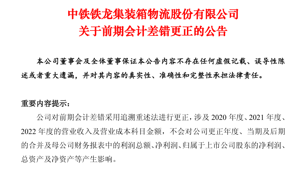 另据铁龙物流4月29日公告,为更加谨慎地执行新收入准则和更加客观、准确地披露会计信息及经营发展情况,公司对下属分、子公司以前年度开展的贸易类业务开展严格自查。基于谨慎性原则,公司对2020年度、2021年度、2022年度部分贸易类业务的会计处理进行差错更正,由总额法改成净额法。