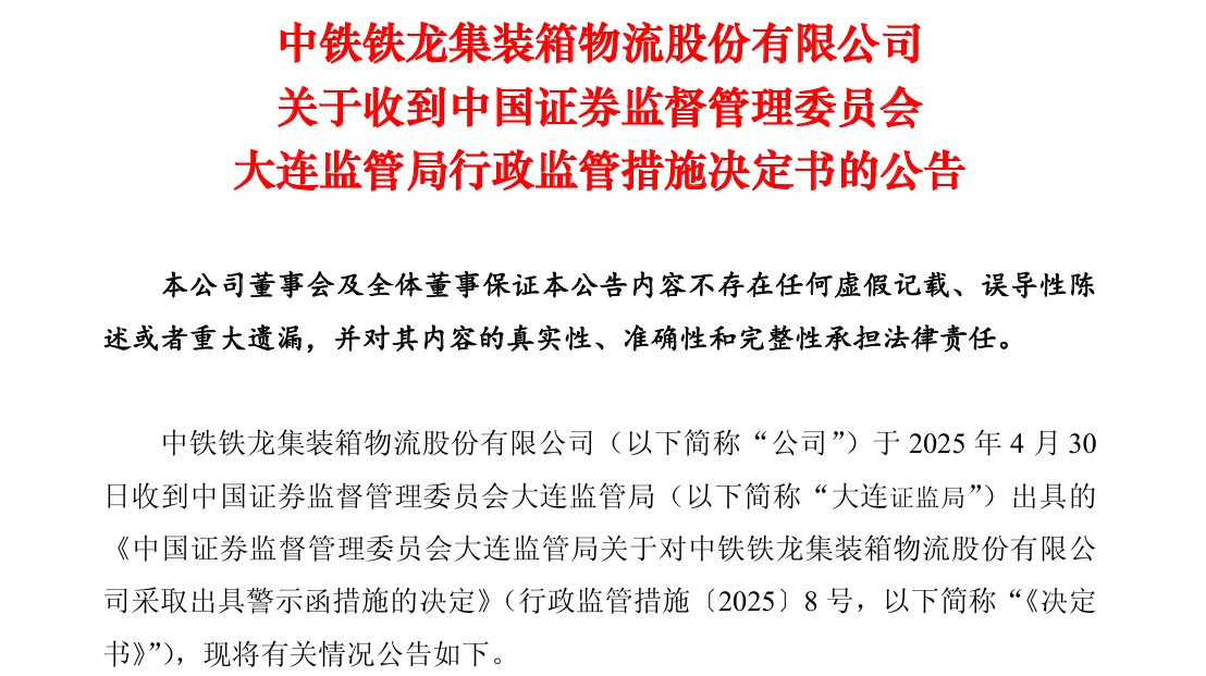 根据《上市公司信息披露管理办法》(证监会令第40号)第五十九条、《上市公司信息披露管理办法》(证监会令第182号)第五十二条的规定,大连证监局决定对铁龙物流采取出具警示函的行政监管措施,并计入资本市场诚信档案数据库。