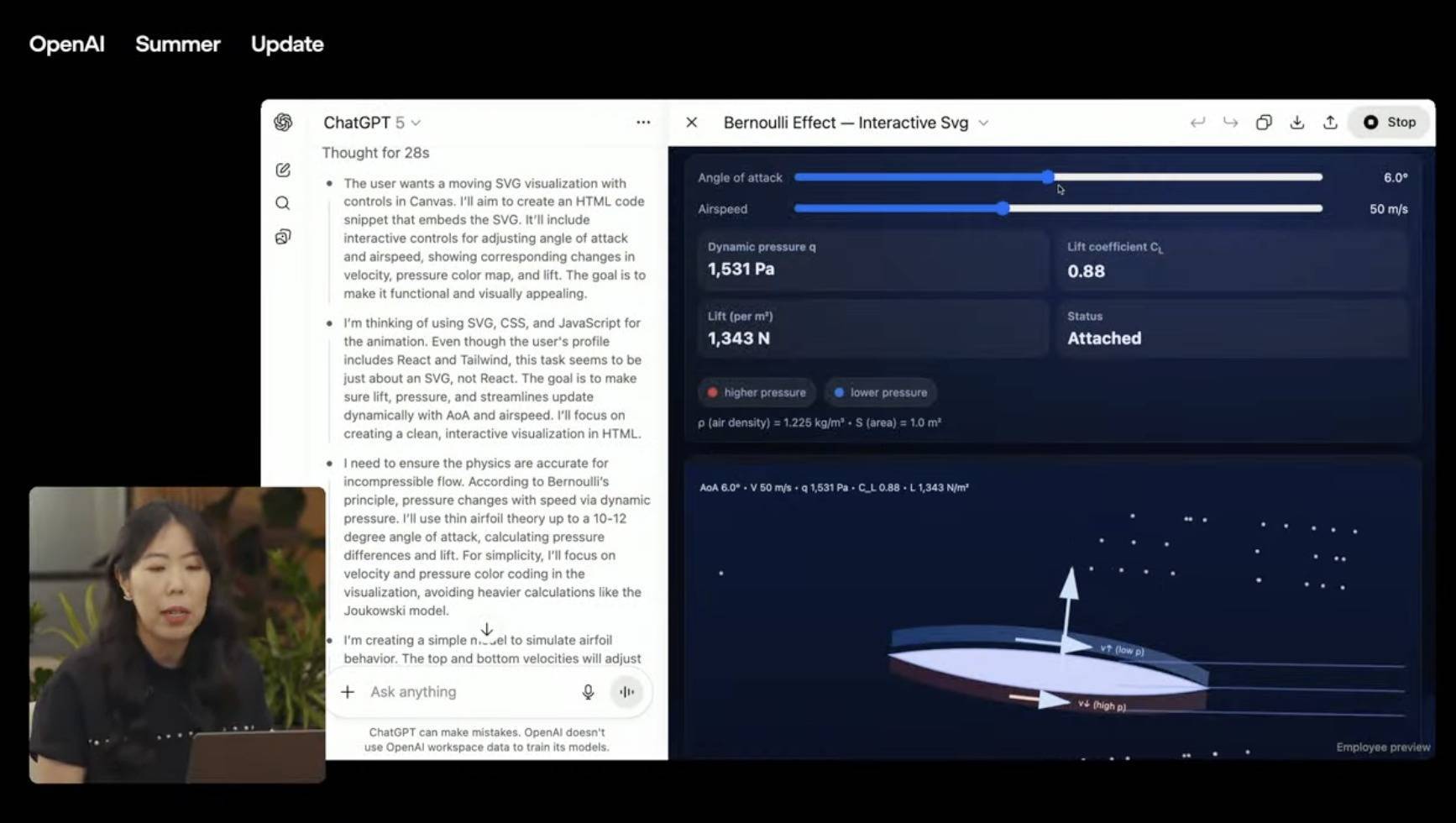 一、靠自主判断规避“过度思考”,编程能力获Cursor创始人认可现场演示中,OpenAI首先展示了GPT-5按需思考的能力。工作人员让GPT-5解释伯努利现象(流体力学里的一个基本原理),这对其而言相对简单。GPT-5判断无需思考,并迅速给出答案。