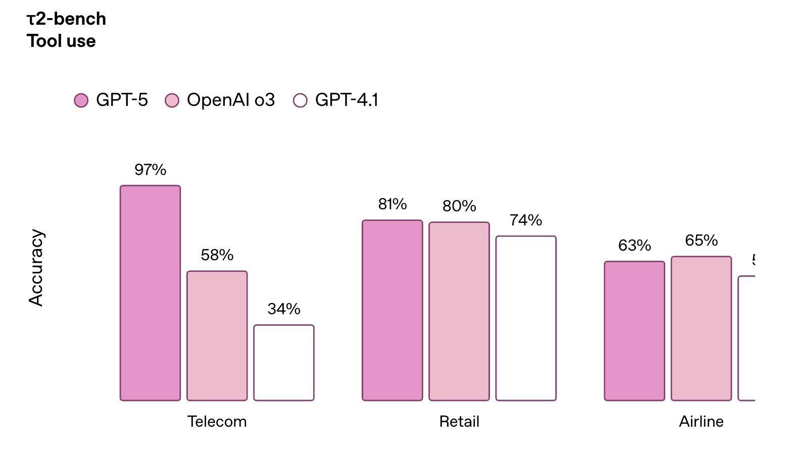 GPT‑5在持续型智能体任务中同样表现卓越,在两个月前刚发布的工具调用基准测试τ2-bench telecom中,以96.7%的成绩刷新了业界最优水平。