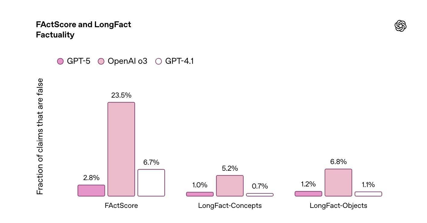 在事实性方面,GPT‑5比其之前的模型更值得信赖。在事实准确性基准测试LongFact和FActScore中,GPT‑5的错误率仅为o3的五分之一。这使得GPT‑5尤其适用于正确性要求高的智能体任务场景,特别是在代码生成、数据处理和决策支持等关键领域。