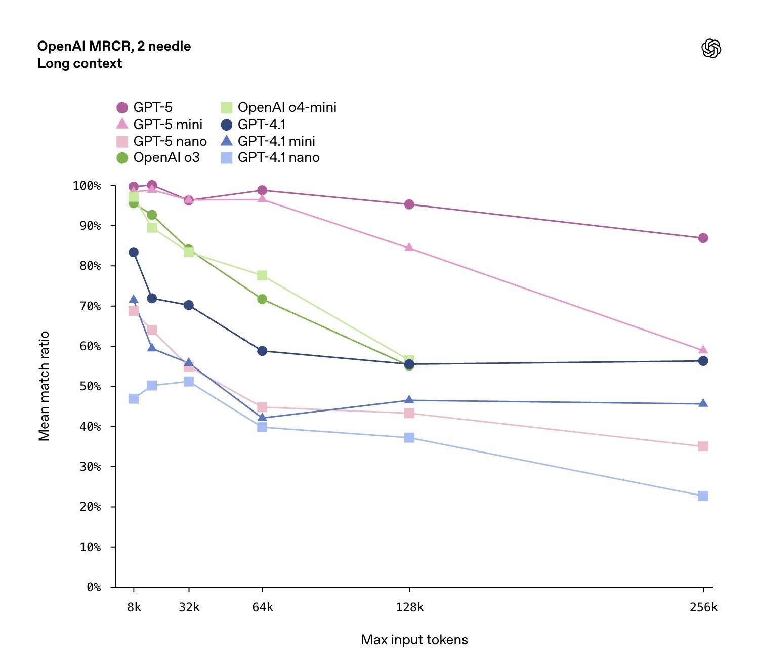 GPT‑5在长背景信息性能方面也展现出显著提升。在OpenAI-MRCR(一种衡量长背景信息检索能力的指标)中,GPT‑5的表现优于o3和GPT‑4.1,且随着输入长度的增加,这种优势会显著扩大。