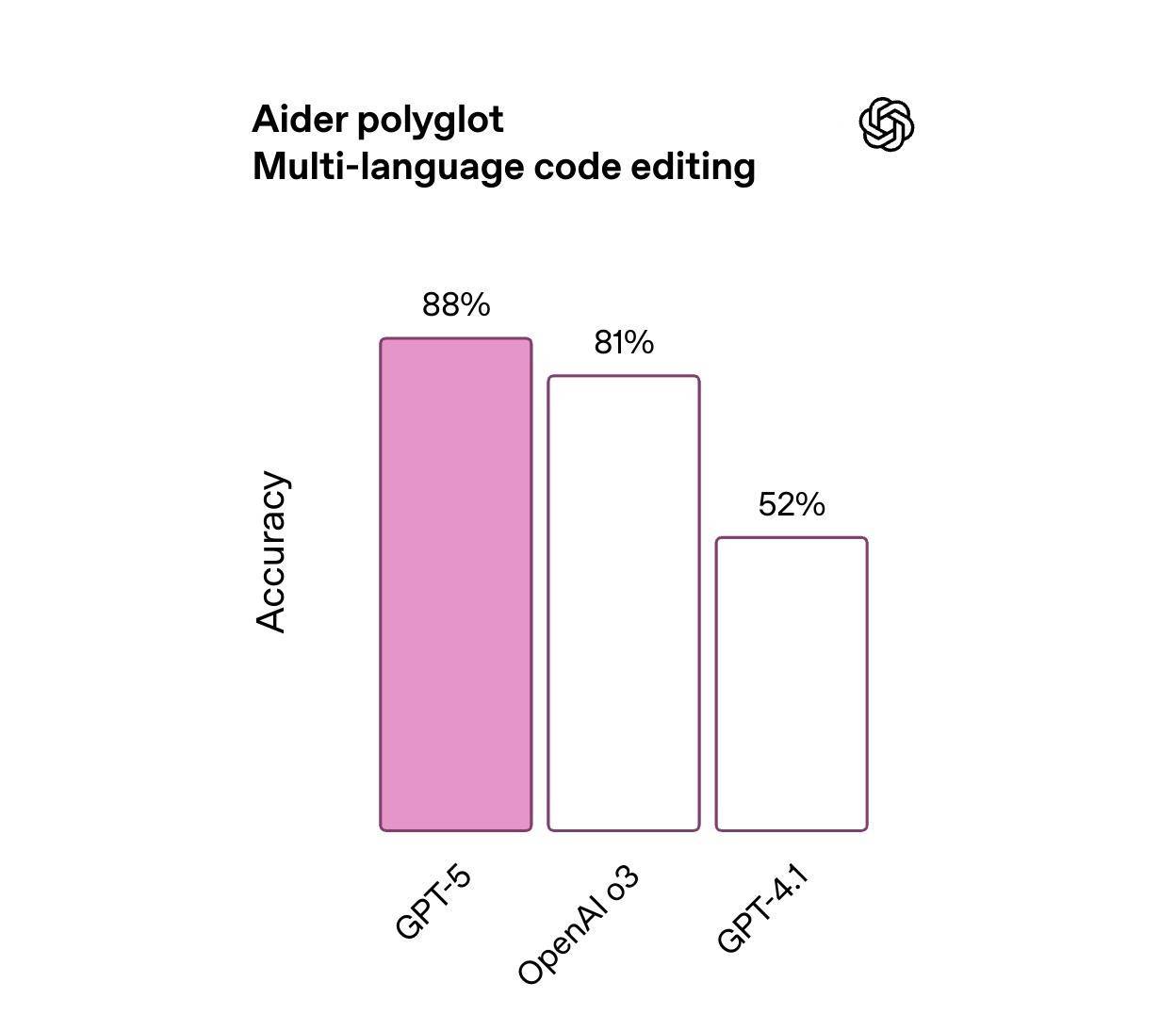 同时,GPT‑5在Aider polyglot测试中得分88%。在内部测试中,其在70%的Web任务开发中表现和OpenAI o3。此外,GPT‑5在深度分析代码库方面表现出色,能够精准解答关于代码模块运作机制及相互协作的问题。