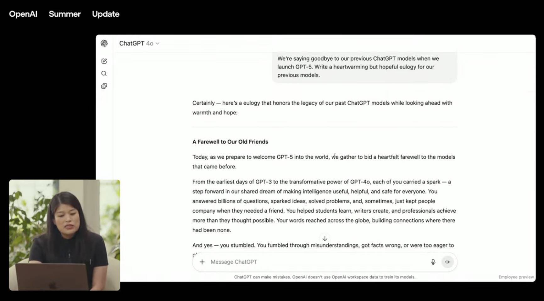 GPT-5在写作方面得到显著提升。比如OpenAI研发人员现场让GPT-5为GPT-4o写了一篇悼文。研究人员称,从生成内容来看,这不像在跟AI聊天,而像一位高智商、高情商的朋友在交流和上课。