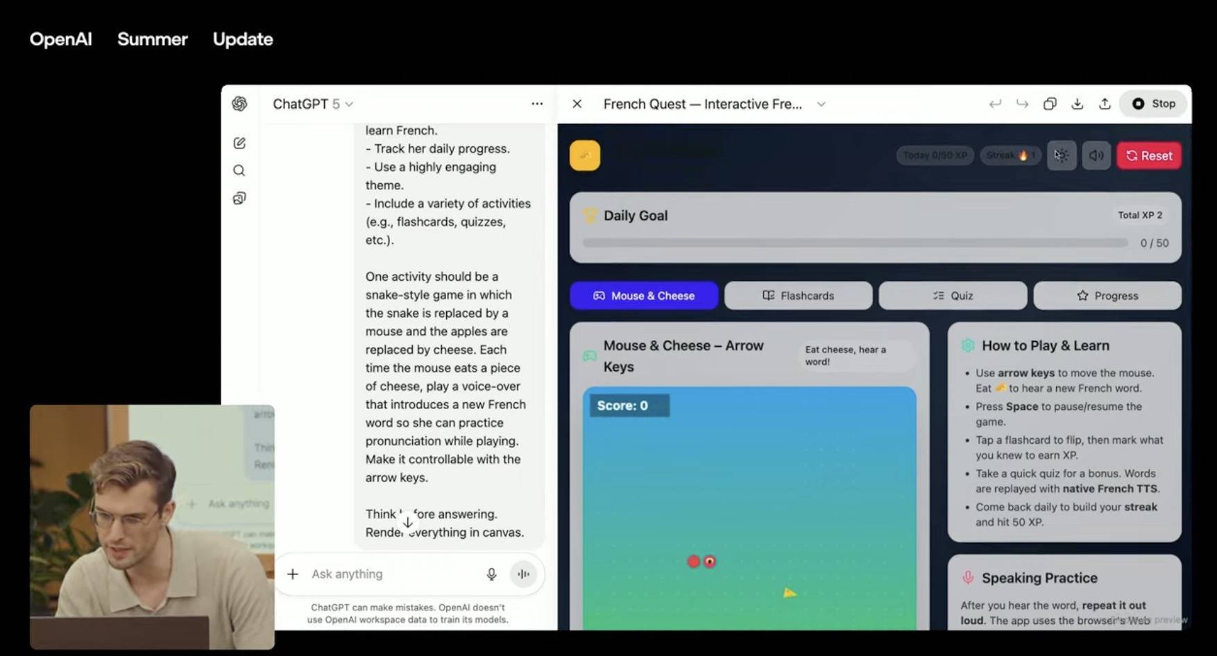 研发人员称,GPT-5是迄今为止最好的编程模型。比如他让GPT-5建立了一个学习法语的网络应用,同时要求GPT-5嵌入一款教育游戏。大约两分钟后,GPT-5生成了一个带有标签、抽认卡、测试等功能的应用,并且成功嵌入了一款贪吃蛇游戏。